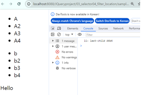 console.log("두번째 myClass>>", $(".myClass").last().text());