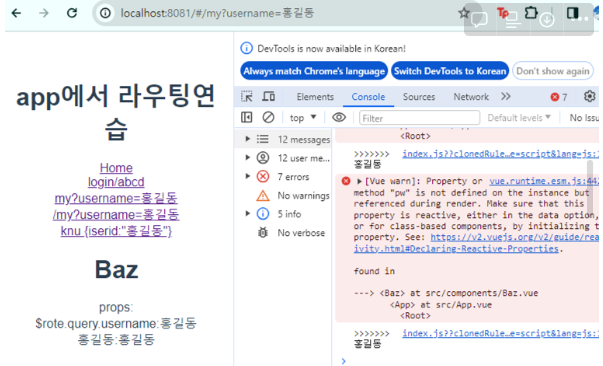 <router-link :to="{path:'/my', query:{username:'홍길동'}}">my?username=홍길동</router-link><br>